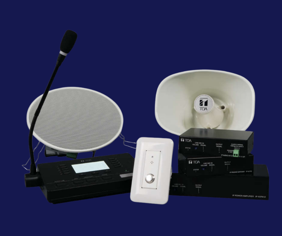 A system that broadcasts announcements and plays background music through integrated speakers.